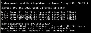 Krok b) odpowiada za test poprawnej łączności z lokalnym routerem. Brak odpowiedzi polecenia ping świadczy o złej konfiguracji połączenia sieciowego lub o braku połączenia (awaria karty sieciowej, kabla, przełącznika sieciowego lub samego routera)